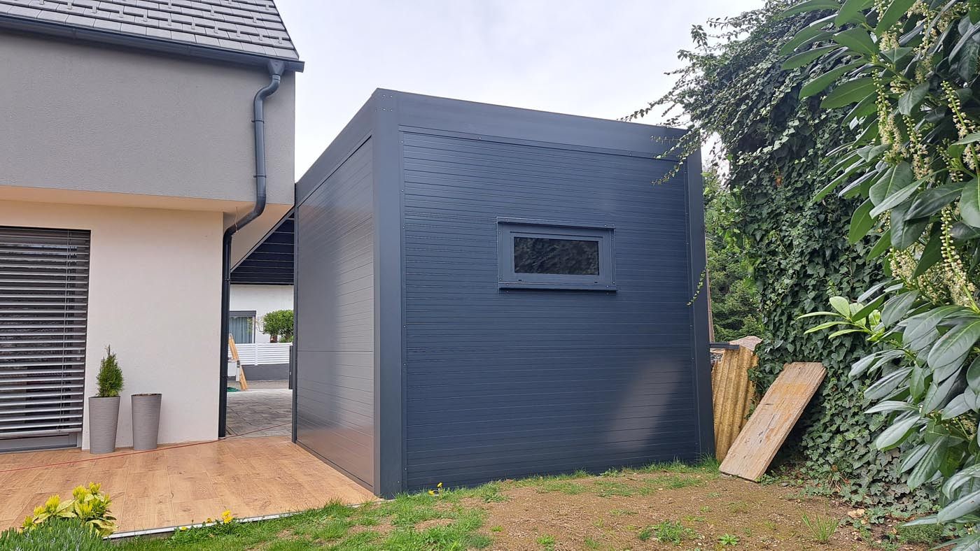 Als durchdachte Ergänzung der Terrasse bzw. des Außenbereichs wurde ein Aluminium-Schuppen in Anthrazit (RAL 7016) hinzugefügt. Dieser passt perfekt zur Pergola und zum Haus und bietet eine praktische, gleichzeitig ästhetisch ansprechende Lösung zur Aufbewahrung und Ordnung des Außenbereichs.