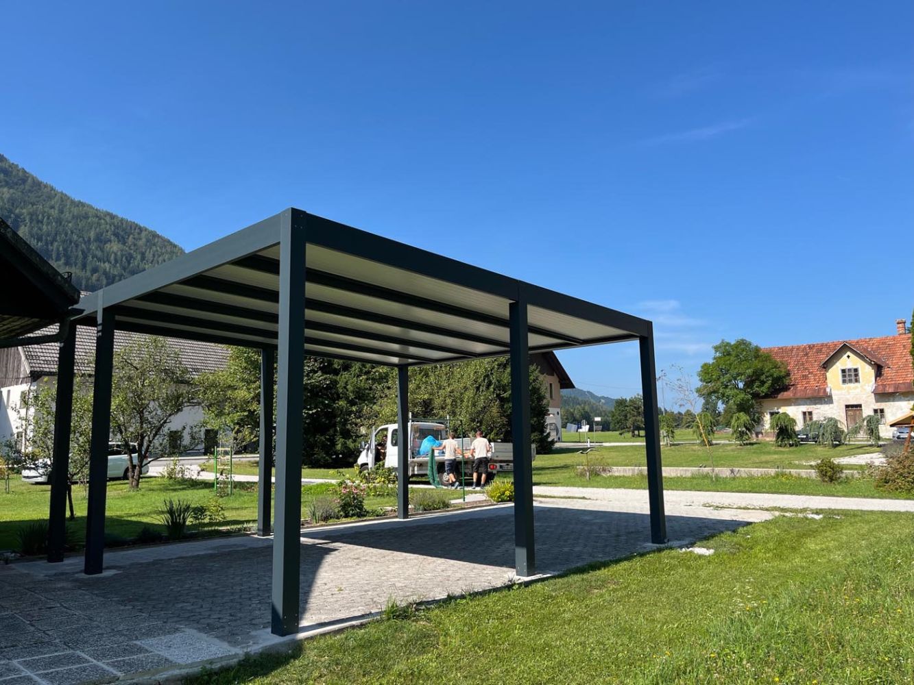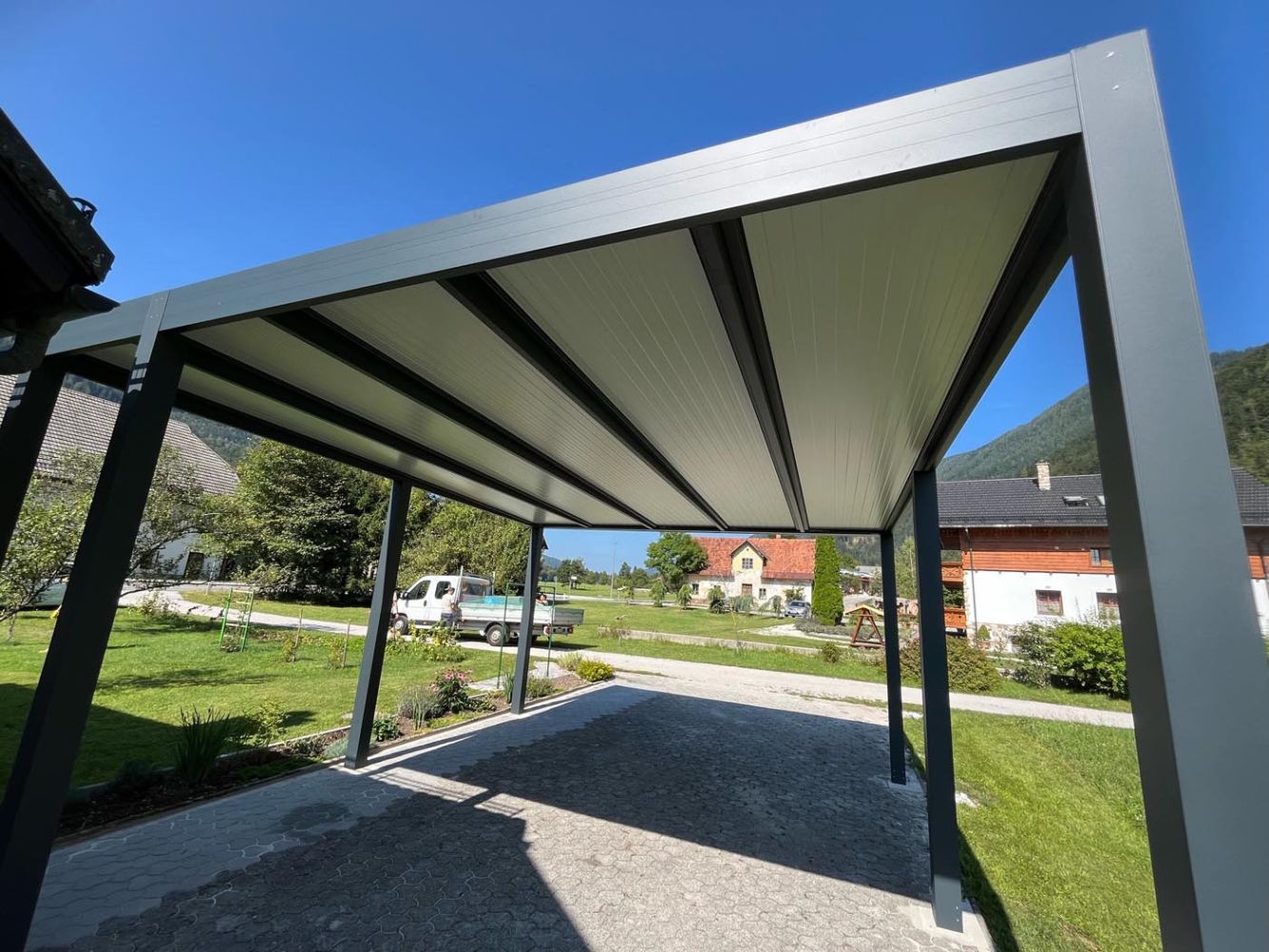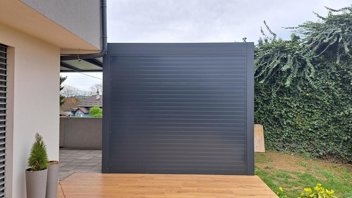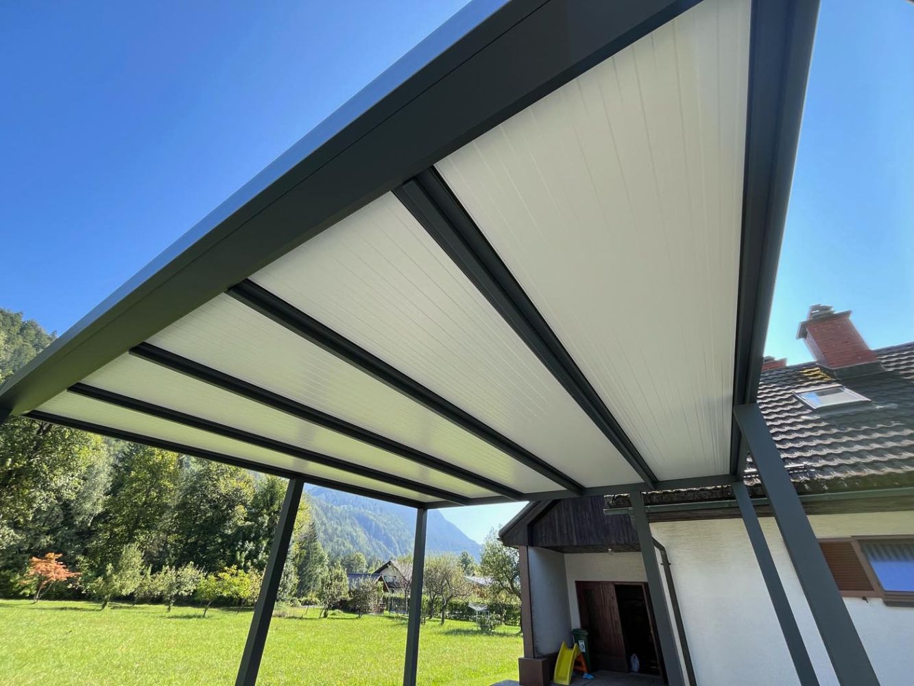 Die feststehende Pergola in Oberkrain ist in einer eleganten Farbkombination ausgeführt – die Konstruktion in Anthrazit RAL 7016 und die festen Aluminium-Paneele in Weiß RAL 9010 schaffen einen modernen Kontrast.