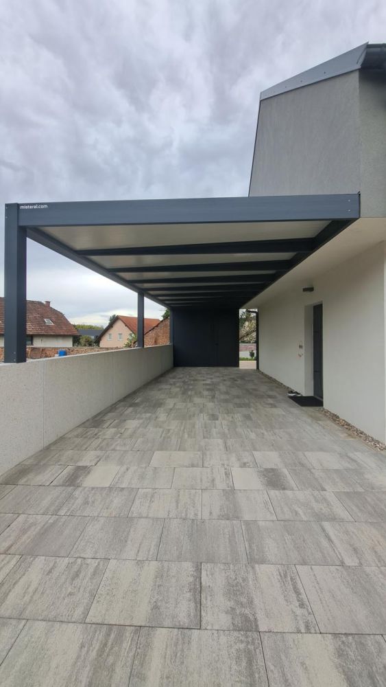 Bei einem Neubau in der Steiermark steht eine feststehende Pergola, die modernes Design mit Ästhetik und Funktionalität kombiniert. Die Konstruktion in elegantem Anthrazit (RAL 7016) und die weißen festen Aluminium-Paneele (RAL 9010) schaffen einen feinen Kontrast, der sich perfekt in die Farbgebung des Hauses einfügt und harmonisch wirkt.