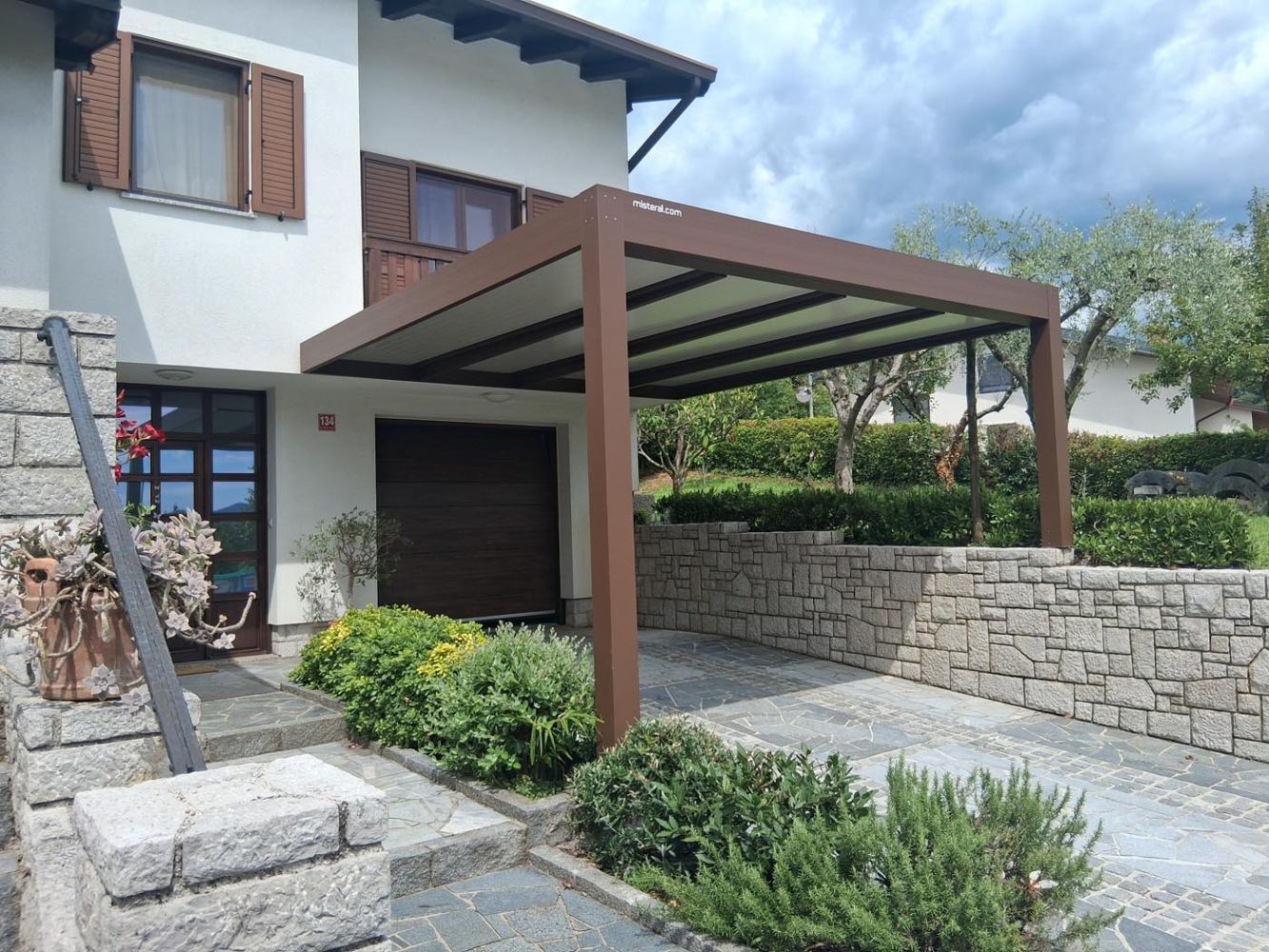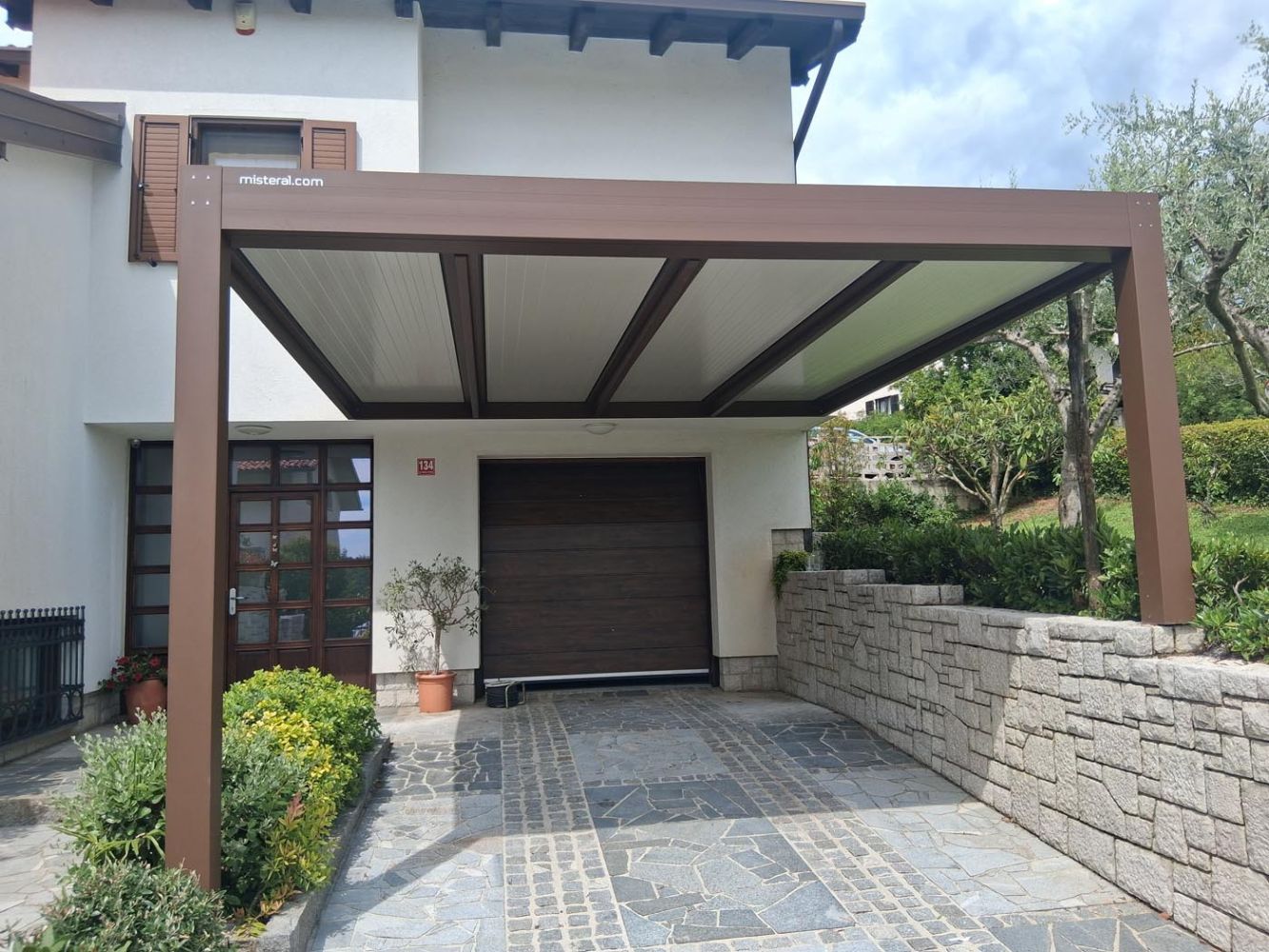 Am Zufahrtsbereich oder auf der Terrasse steht eine feststehende Pergola, die als elegante und praktische Schutzlösung für Autos konzipiert wurde. Sie ist in einem warmen Braunton RAL 8028 ausgeführt, während die Aluminium-Paneele in Weiß RAL 9010 gehalten sind. Diese Farbkombination passt perfekt zum Haus und harmoniert mit dessen Architektur.