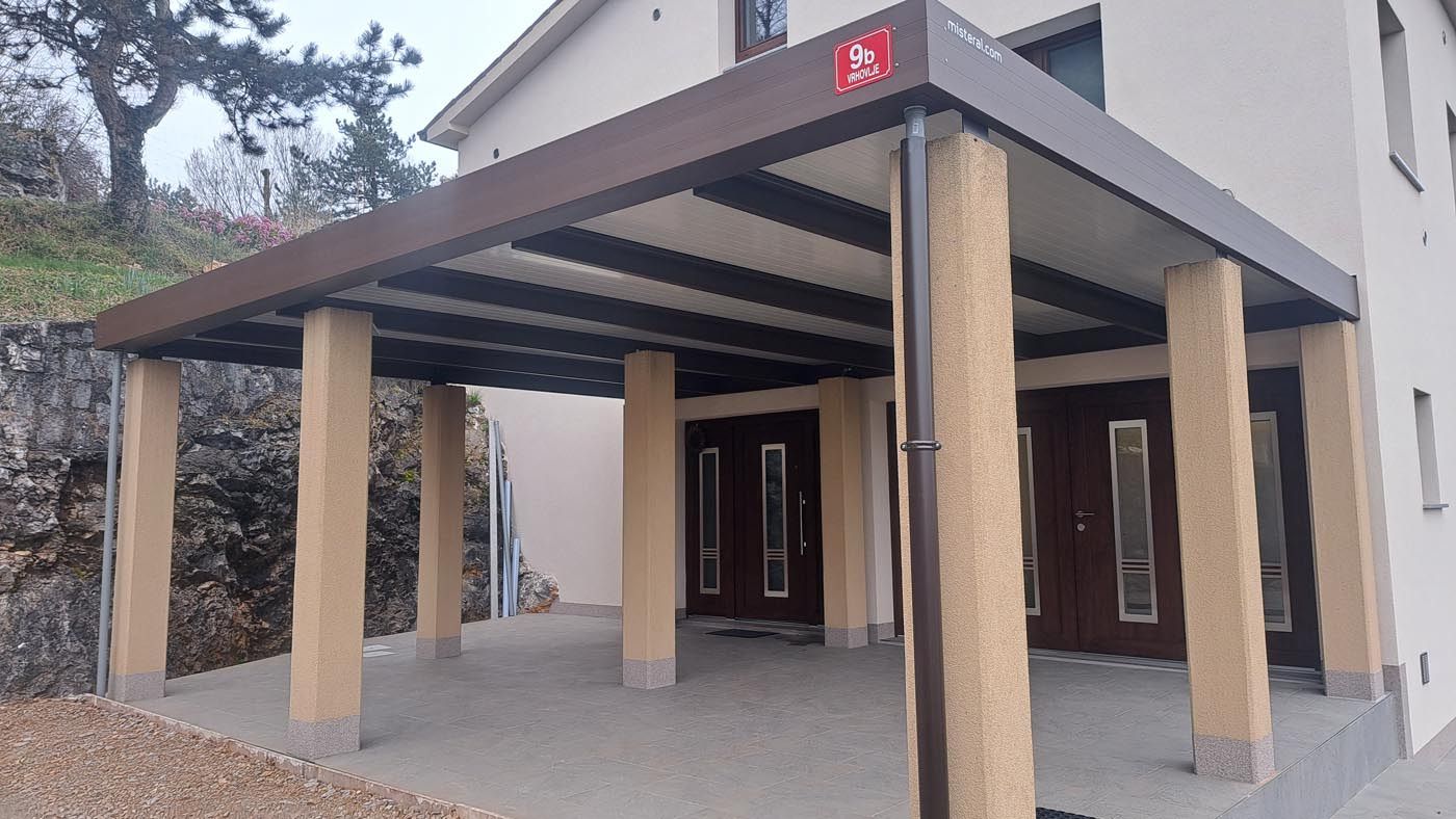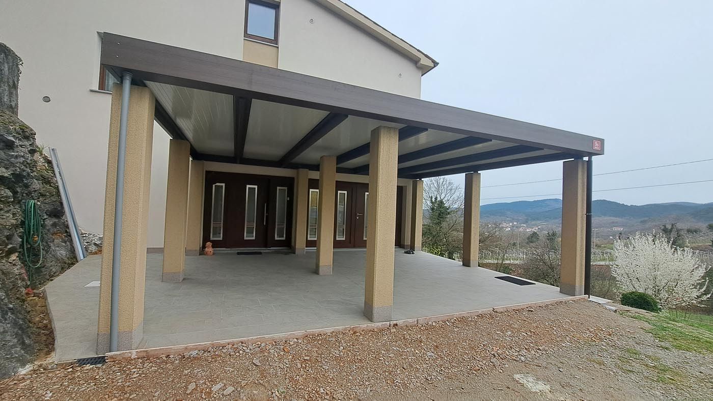 Auf der Terrasse vor dem Hauseingang in Sežana steht eine feststehende Pergola, deren Konstruktion in schokoladenbraun RAL 1247 ausgeführt ist, während die Aluminium-Paneele in Weiß RAL 9010 gehalten sind, wodurch ein angenehmer Kontrast entsteht, der zur Architektur des Hauses passt.