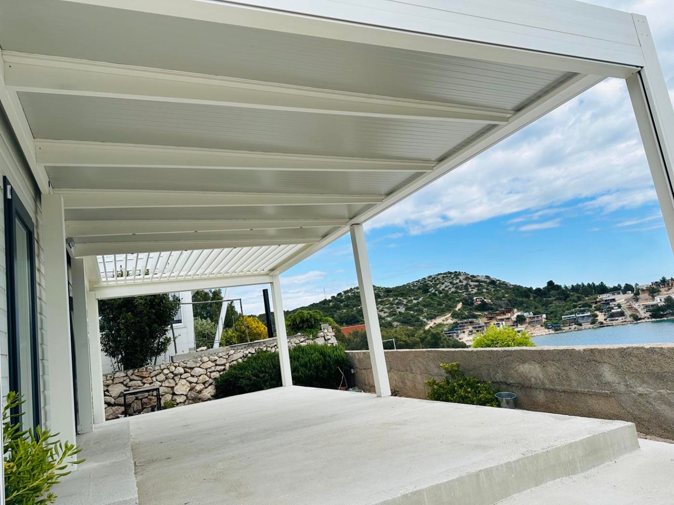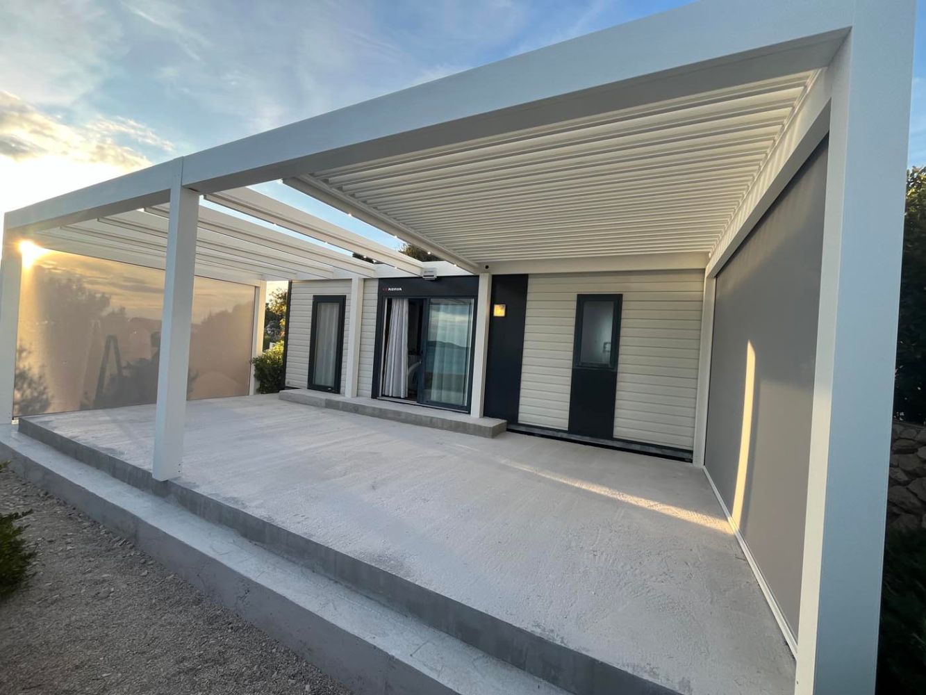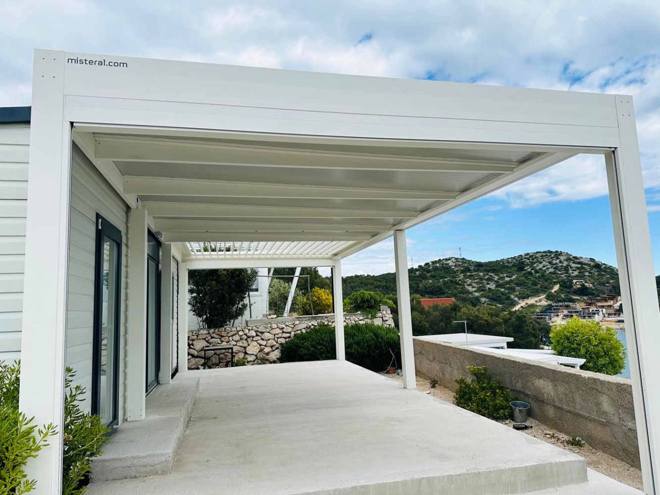Die schöne Pergola vor einem Mobilheim in Sukošan ist in elegantem, reinem Weiß RAL 9010 ausgeführt, eine ausgezeichnete Wahl für die Küstenumgebung, die sich perfekt in die Umgebung einfügt. Besonderheit dieser Pergola ist die zweiteilige Ausführung – ein fester und ein bioklimatischer Teil. Der feste Teil besteht aus fünf Feldern Aluminium-Paneele, der bioklimatische Teil aus einem Feld paralleler Lamellen, die sich bis zu 160° drehen lassen und so eine flexible Beschattung und Schutz bieten.