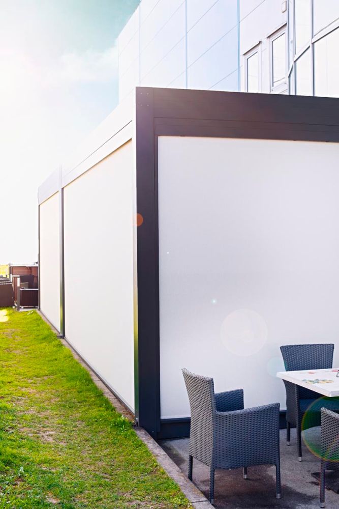 Vpeta je v steno objekta in na drugi strani podprta s 3 stebri (dodatni steber omogoča vgradnjo ZIP screen rolojev).