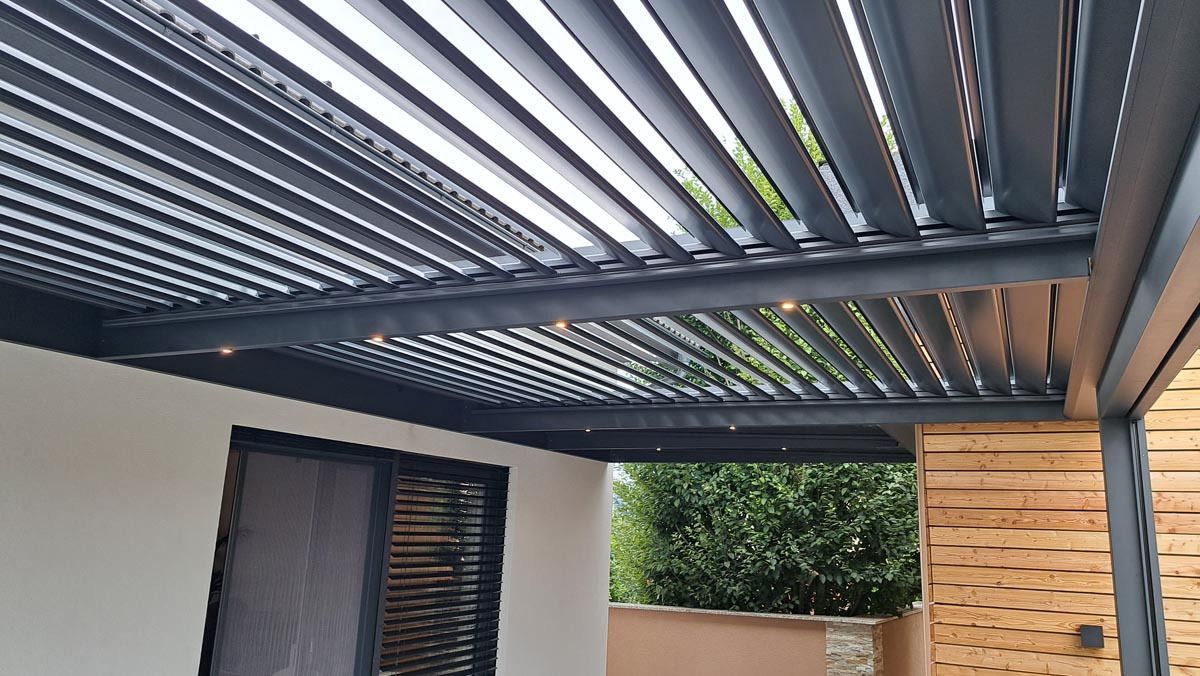 Bioklimatska pergola v elegantni antracit barvi (RAL 7016). S svojo preprosto in hkrati dovršeno zasnovo ponuja udobno zavetje za bivanje na prostem v vseh letnih časih.