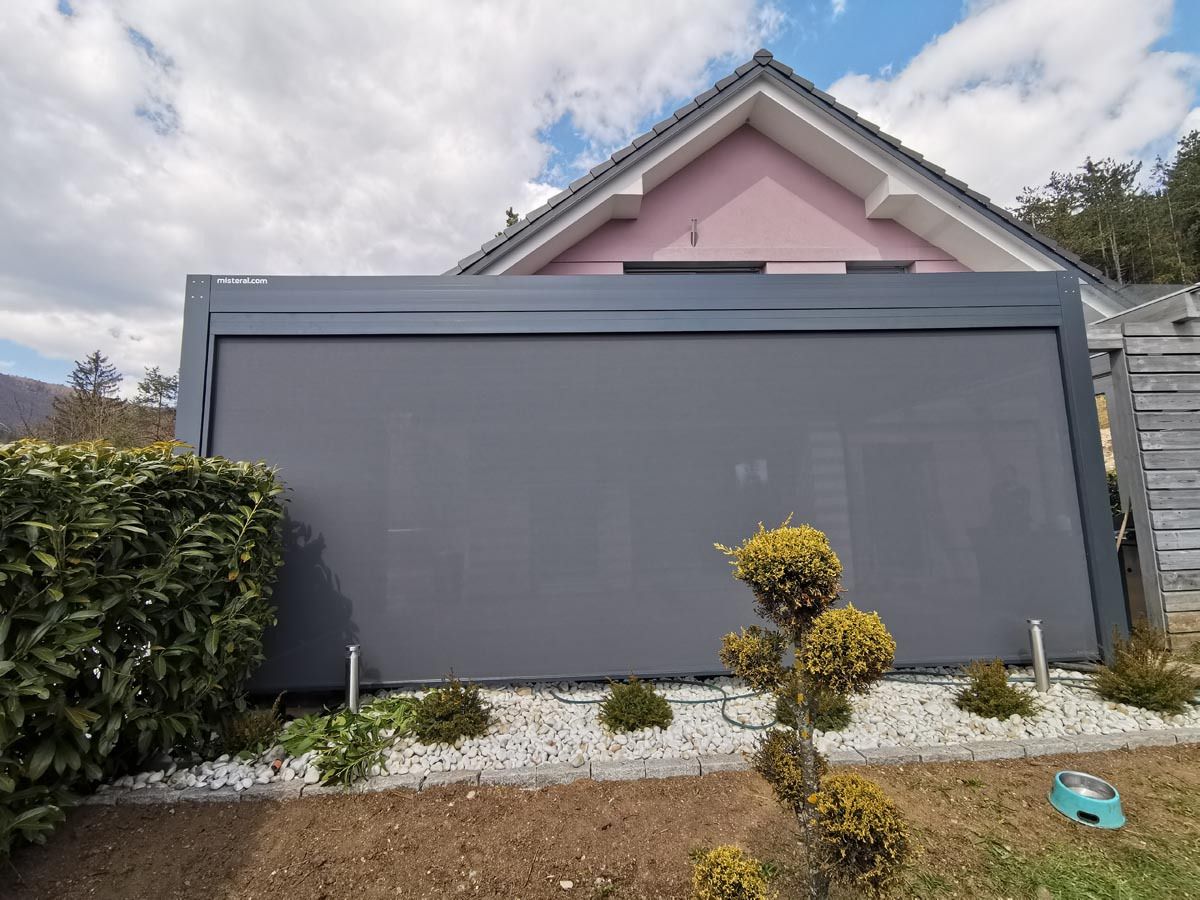 Za dodatno zaščito in večje udobje so na pergolo nameščeni trije ZIP screen roloji v antracit odtenku, ki učinkovito ščitijo pred soncem, vetrom in radovednimi pogledi, hkrati pa omogočajo zračen in svetel prostor tudi, ko so spuščeni. Vgrajene LED luči diskretno osvetljujejo prostor pod pergolo in ustvarjajo prijetno atmosfero v večernih urah.