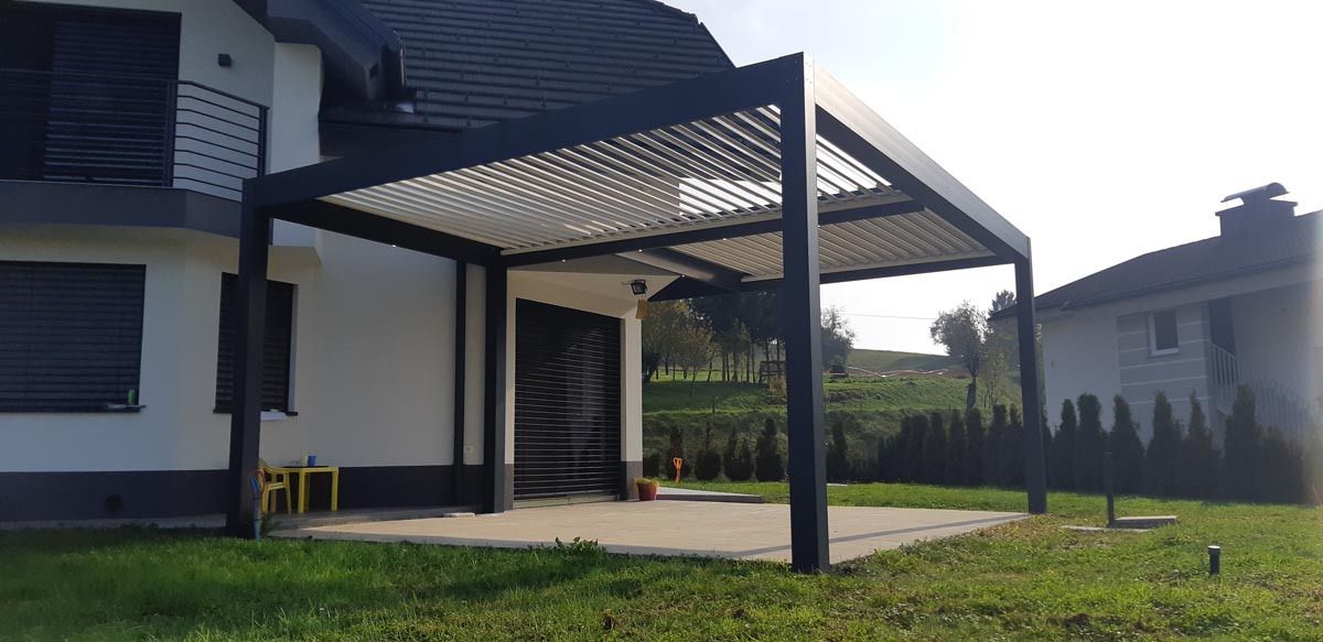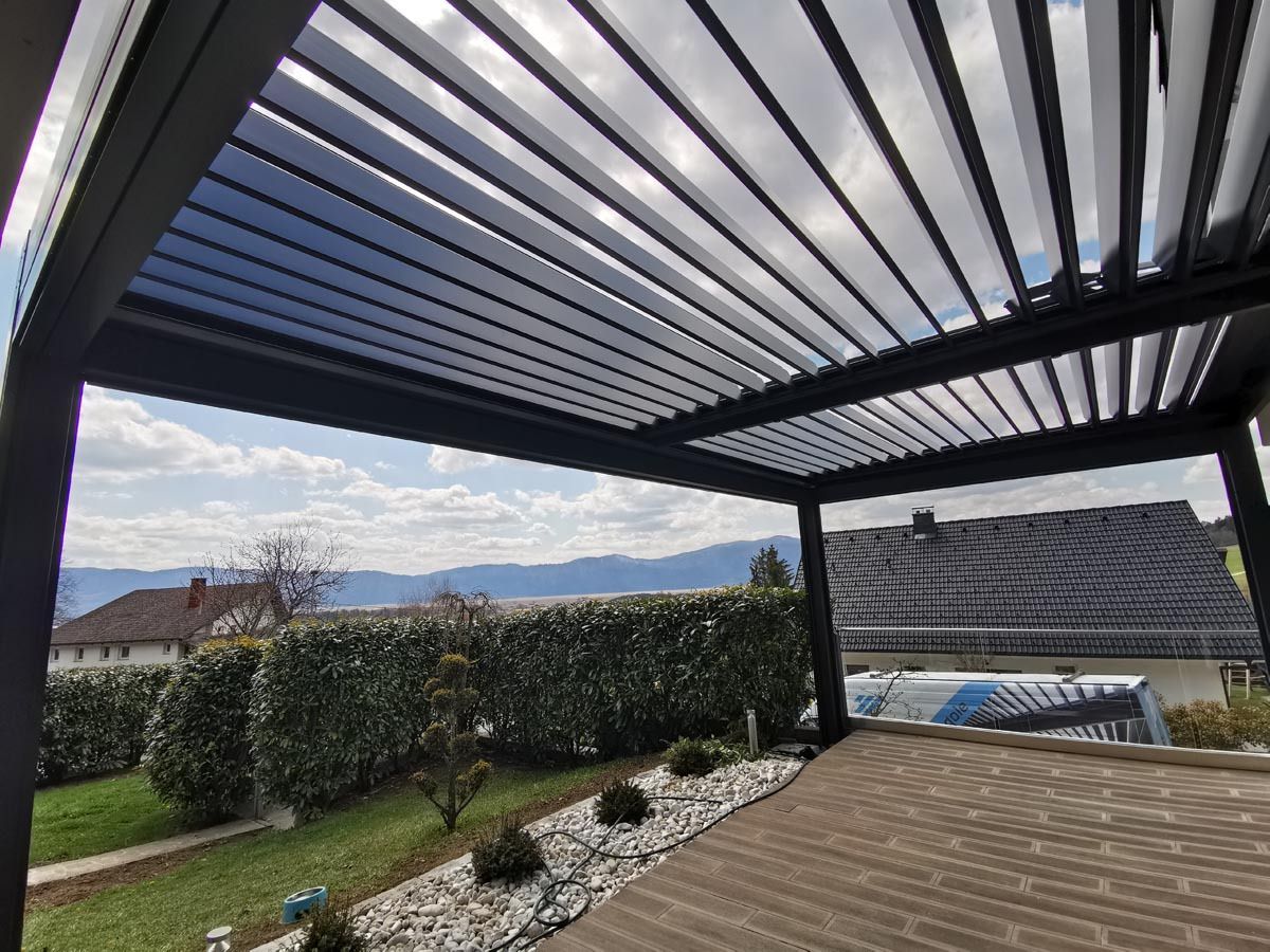 Na terasi pred hišo je postavljena bioklimatska pergola v kombinaciji antracit konstrukcije (RAL 7016) in belih lamel (RAL 9010), katera ustvarja prijeten zunanji prostor za bivanje v vseh vremenskih pogojih.