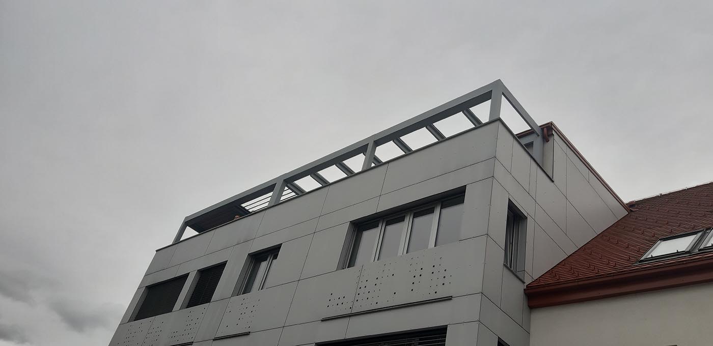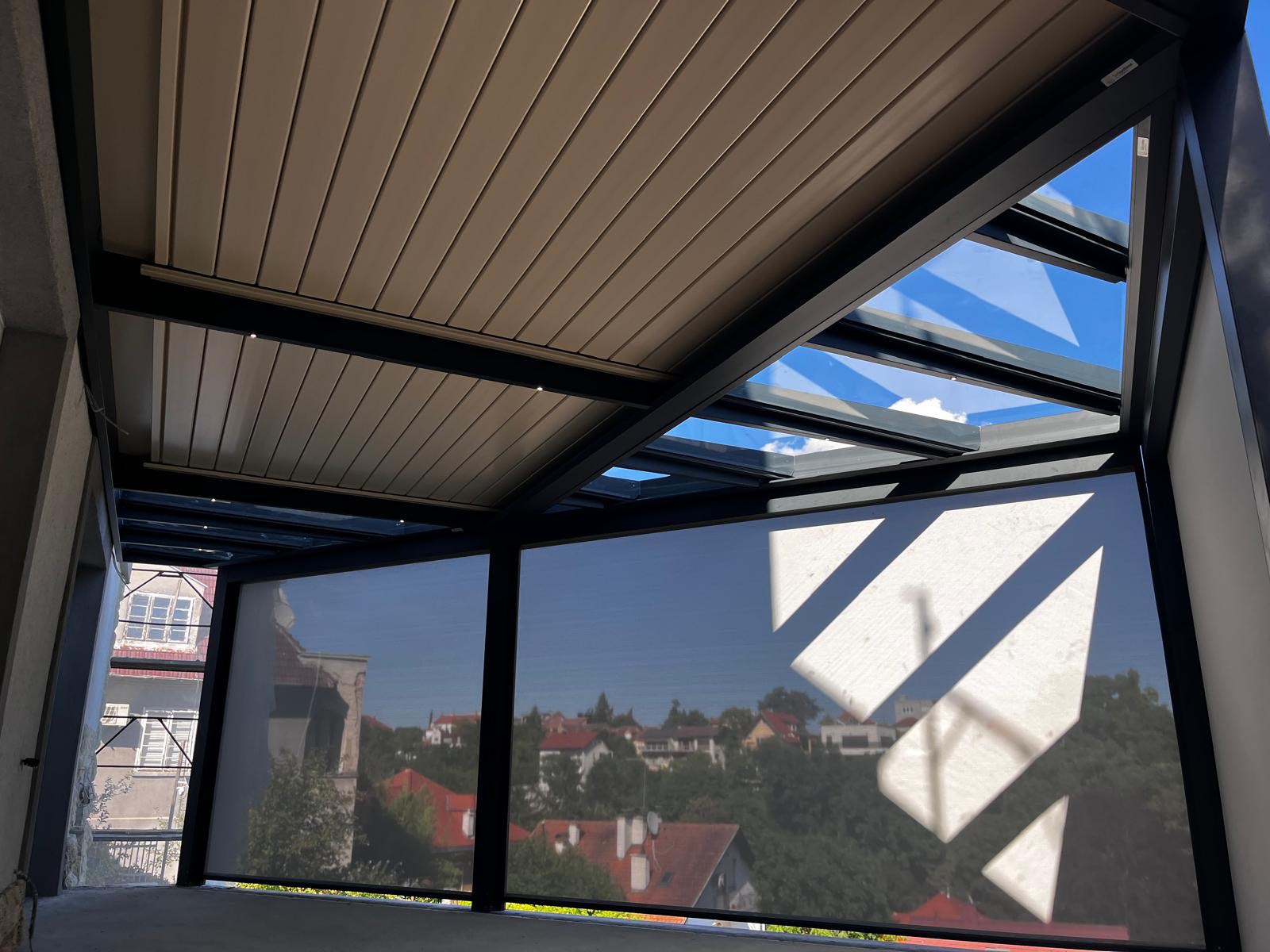 Zum Schutz vor sommerlicher Überhitzung kann die Pergola zusätzlich mit einer äußeren Misteral-Stoffbeschattung oder horizontalen Lamellen ausgestattet werden, die die Aufheizung der Oberfläche reduzieren, ohne das elegante Erscheinungsbild zu beeinträchtigen. |